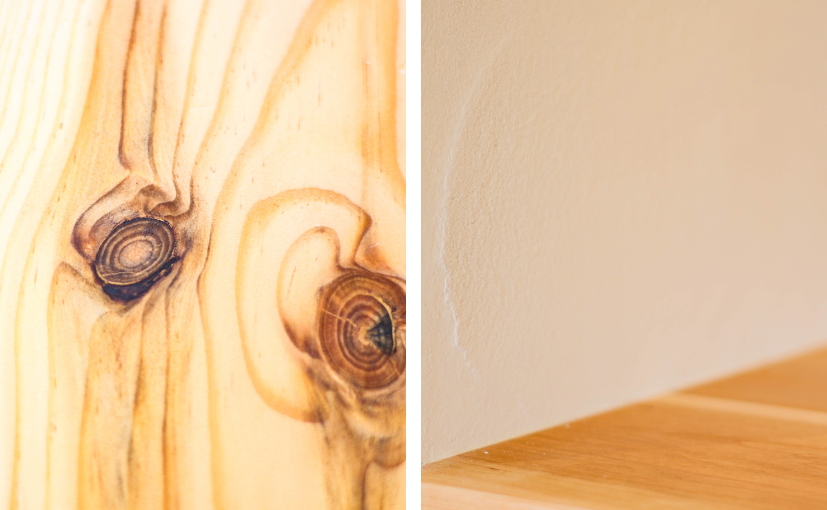 構造体と床には無垢のアカマツを使用。独特な木目を持つこの素材は、色艶があってとても美しいです。